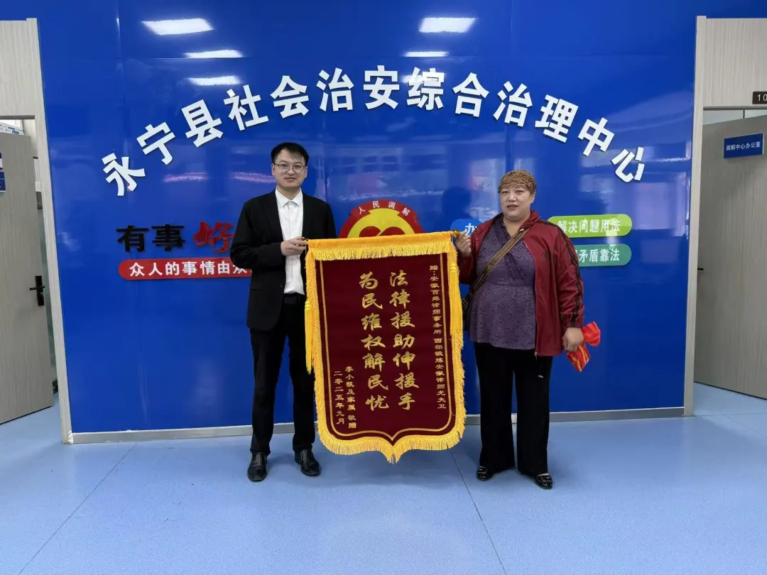 2025年9月,宁夏永宁,回族大妈马某将一面绣着“法律援助伸援手,为民维权解民忧”的锦旗,紧紧递到安徽青年律师尤大卫手中。锦旗上的金线映着她含泪的笑——就在几天前,正是这位青年律师为她车祸卧床的儿子李某追回98308.89元赔偿款,让这个早年丧父、靠四处借钱维持治疗的家庭,终于卸下了“医药费”的千斤重担。